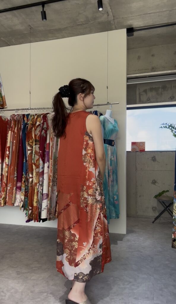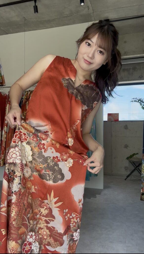 華やかさの中にも落ち着きがあり、どこか懐かしい和の美を感じさせる一着です。